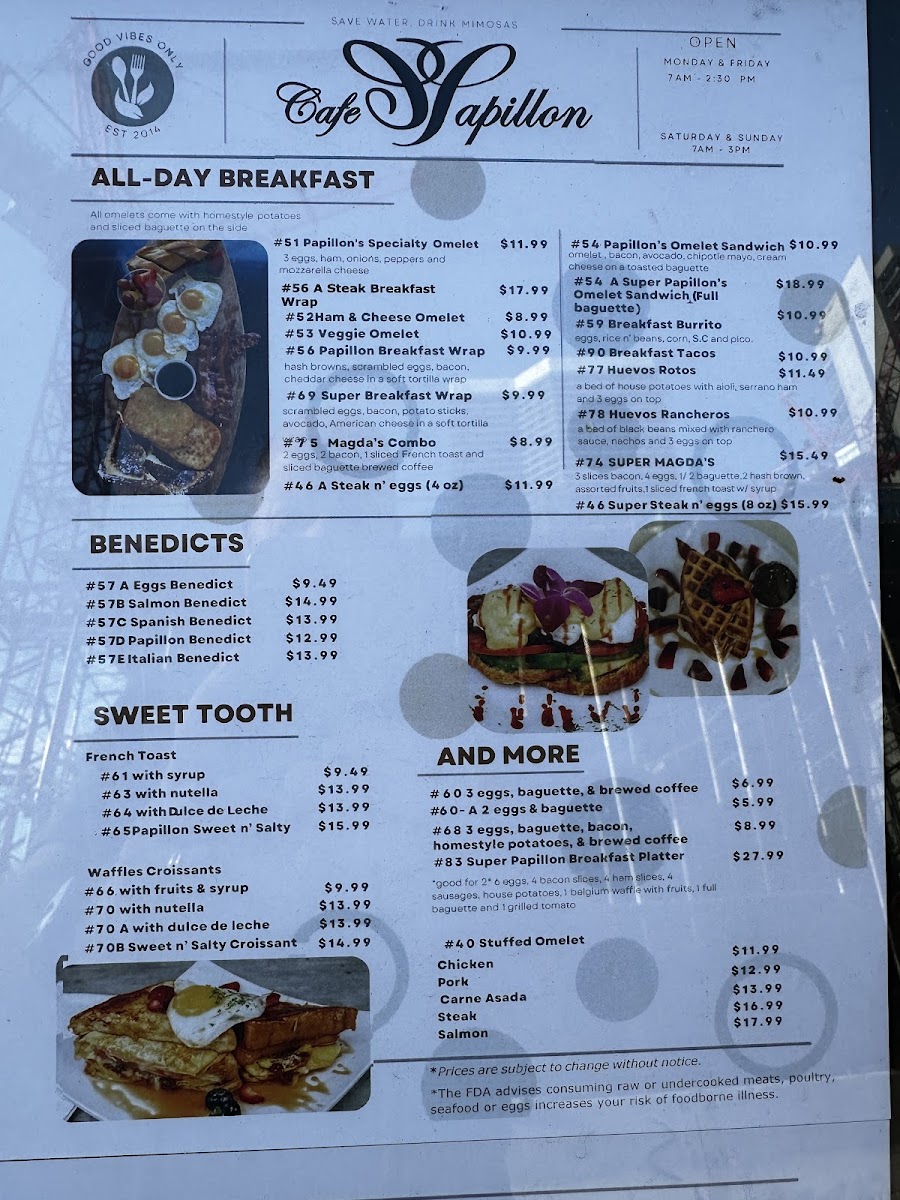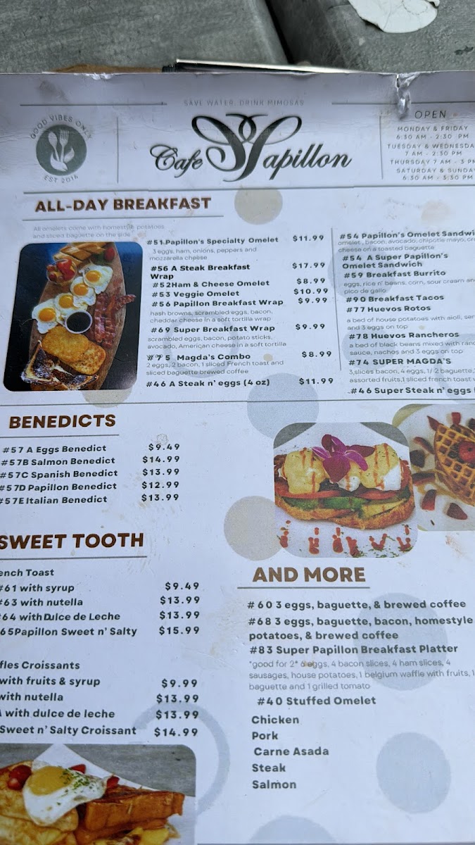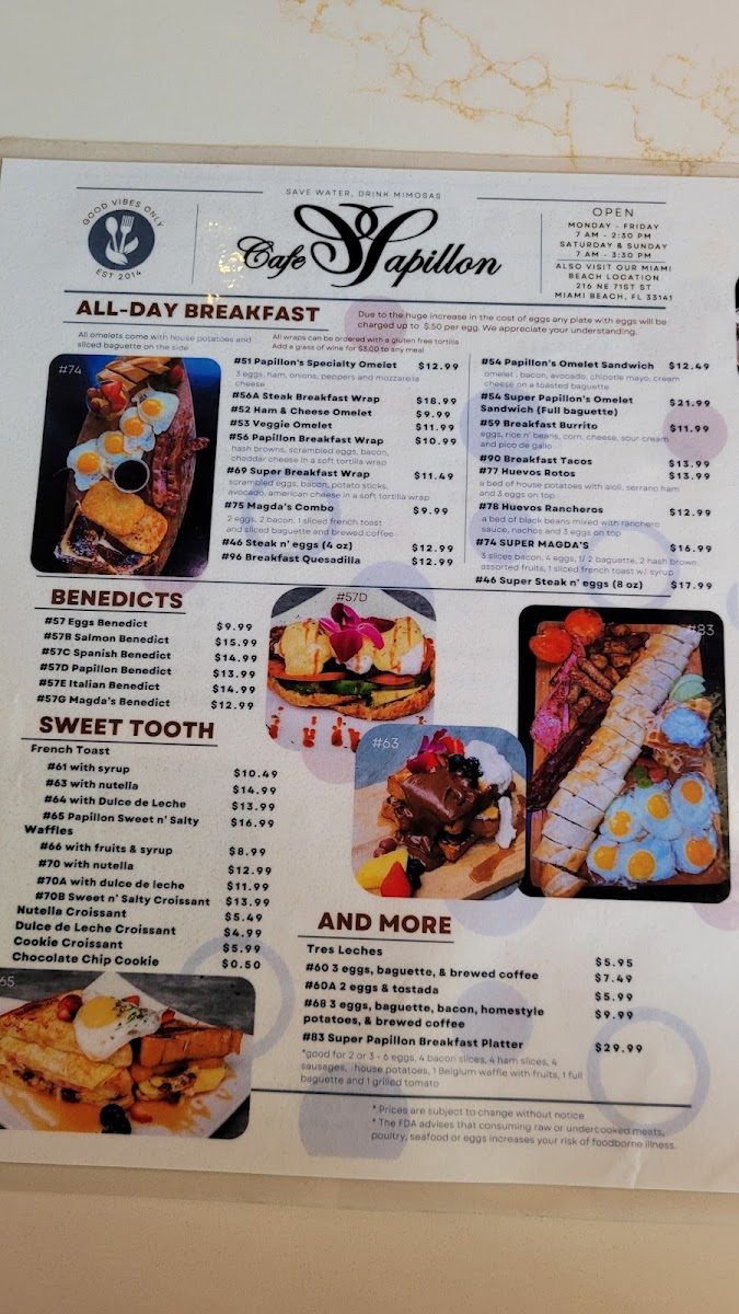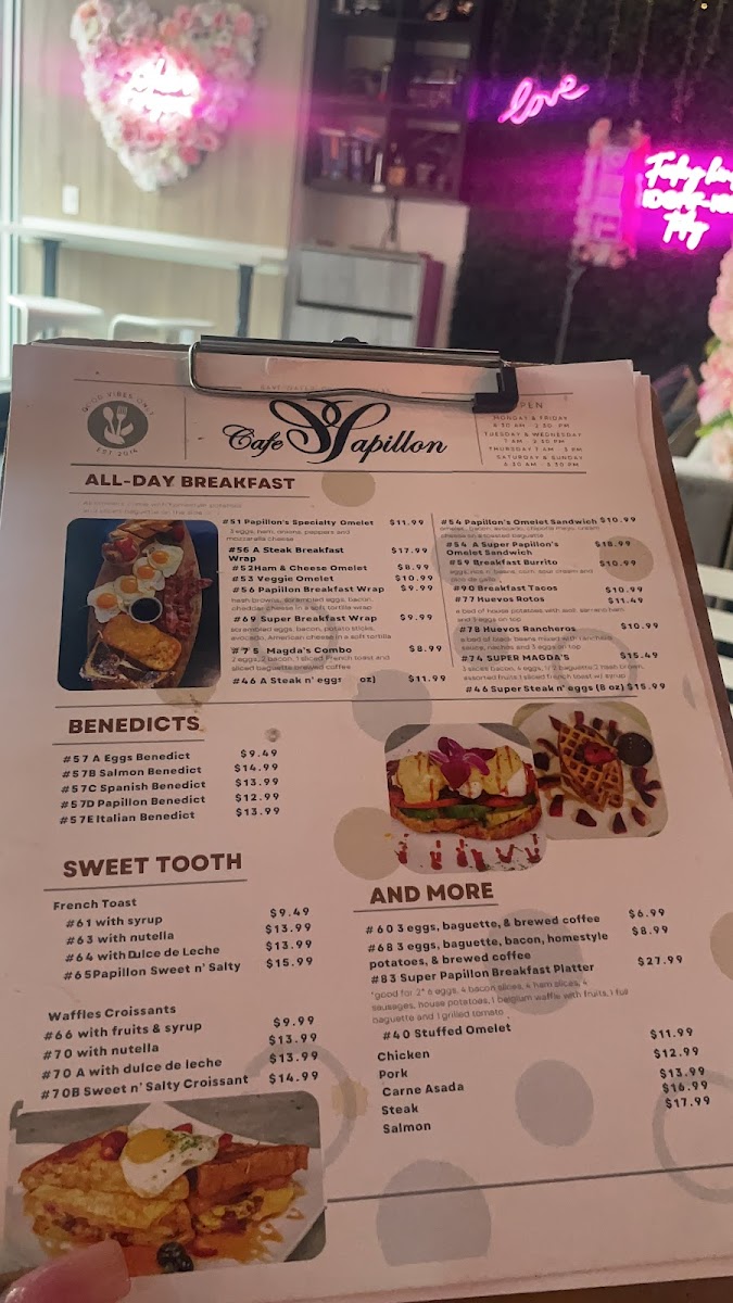Welcome to Cafe Papillon, a delightful cafe nestled in the heart of Miami. With its inviting ambiance adorned with neon signs and lush greenery, it’s the perfect haven for breakfast enthusiasts. The menu boasts gourmet offerings that celebrate fresh ingredients. Notable highlights include the Stuffed Tuna Avocado Salad, served with crisp cucumbers and tangy olive, and the hearty Cuban Philly Cheesesteak, featuring a perfect blend of beef and cheddar. Guests rave about the Papillon Special Omelette and the indulgent Dulce de Leche Croissant Waffle, which perfectly surround you in comforting flavors. The cafe also tempts with its vibrant beverages, from refreshing fresh-squeezed juices to artisanal coffee blends. With affordable prices and a stellar menu, Cafe Papillon is truly a must-visit destination for anyone craving delicious meals in a cozy setting.