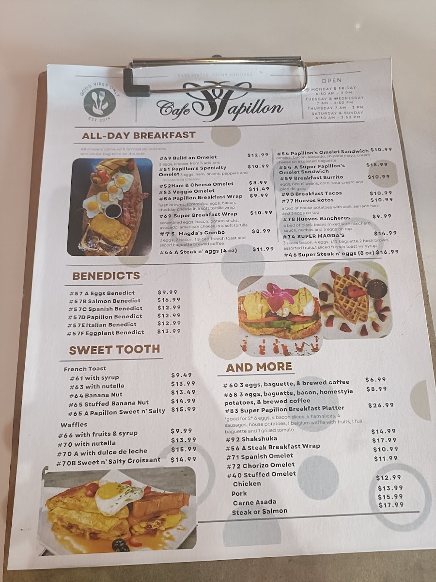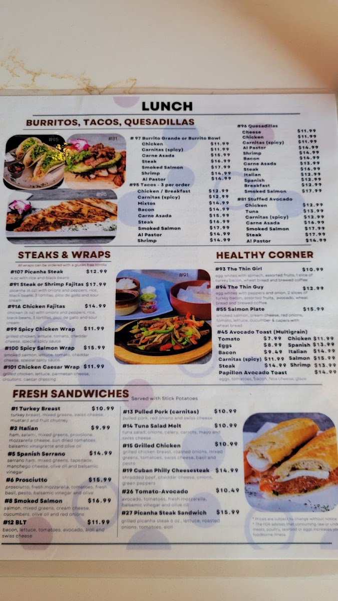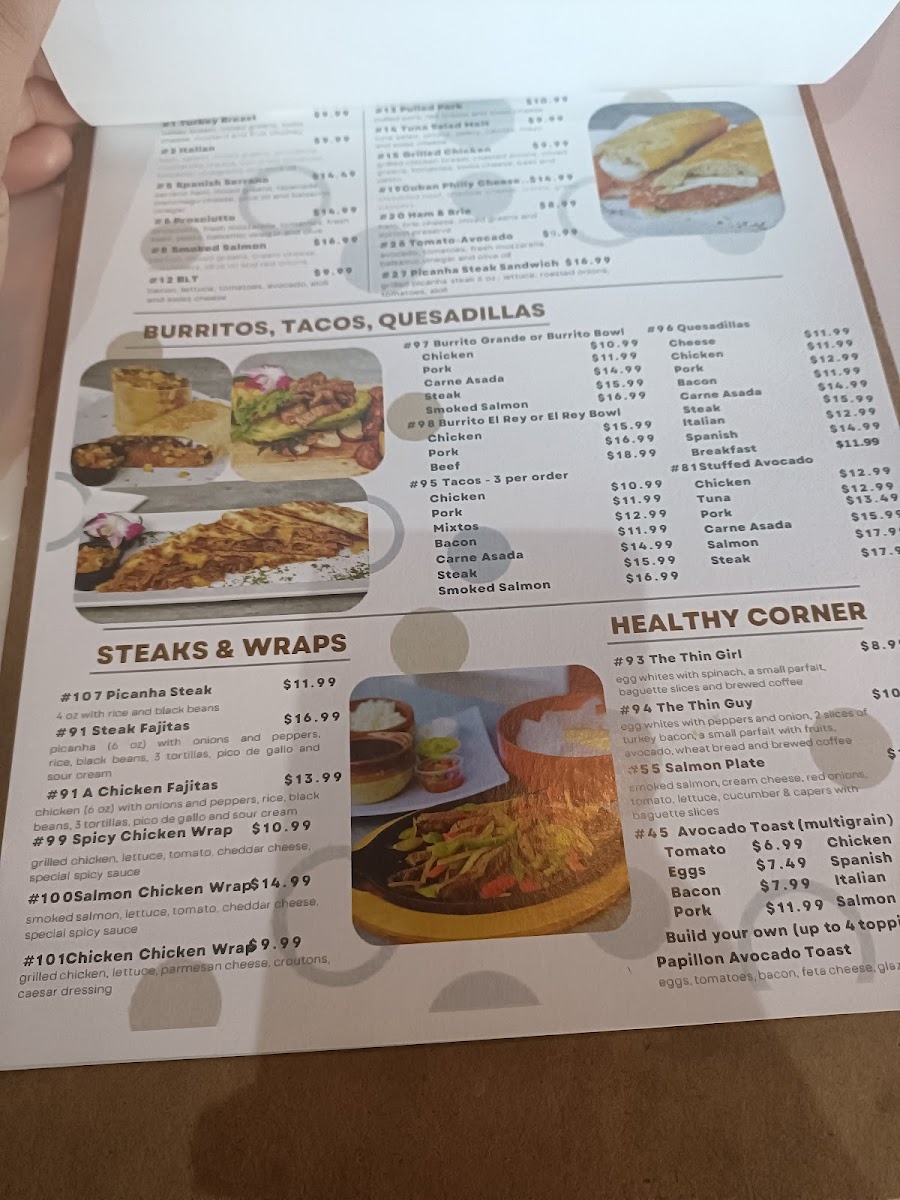 Welcome to Cafe Papillon, a delightful cafe nestled in the heart of Miami. With its inviting ambiance adorned with neon signs and lush greenery, it’s the perfect haven for breakfast enthusiasts. The menu boasts gourmet offerings that celebrate fresh ingredients. Notable highlights include the Stuffed Tuna Avocado Salad, served with crisp cucumbers and tangy olive, and the hearty Cuban Philly Cheesesteak, featuring a perfect blend of beef and cheddar. Guests rave about the Papillon Special Omelette and the indulgent Dulce de Leche Croissant Waffle, which perfectly surround you in comforting flavors. The cafe also tempts with its vibrant beverages, from refreshing fresh-squeezed juices to artisanal coffee blends. With affordable prices and a stellar menu, Cafe Papillon is truly a must-visit destination for anyone craving delicious meals in a cozy setting.